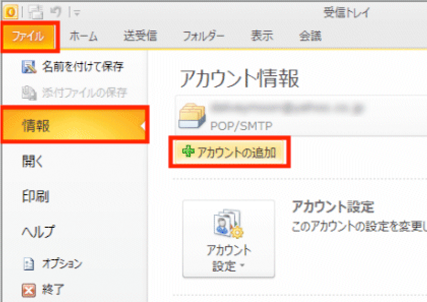 以下は Outlook 2010 をご利用中でアカウントを追加する場合の手順です。