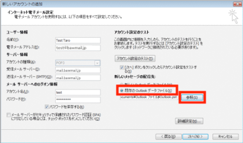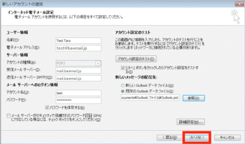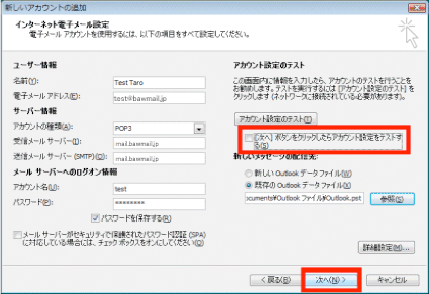 ※初期設定で[次へ]ボタンをクリックしたらアカウント設定をテストする]オプションが有効になっているため、そのまま[次へ]をクリックすると、設定されたアカウント情報を使ってテストメッセージの送受信が行われます。テストを行いたくない場合は、[次へ]ボタンをクリックしたらアカウント設定をテストする]オプションチェックボックスをオフにしてから [次へ] をクリックしてください。