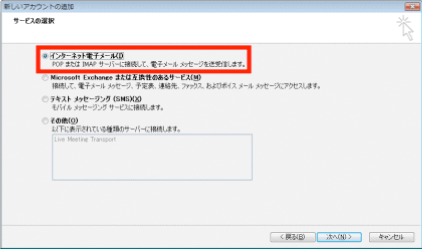 3.[サービスの選択] 画面で、[インターネット電子メール] を選択して [次へ] をクリックします。