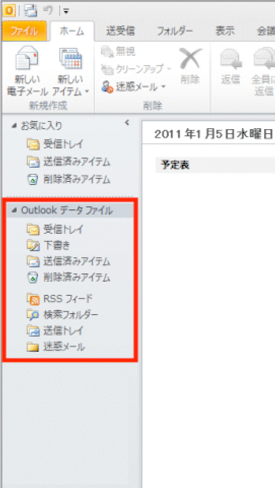 - 注 : 初めて Outlook を起動した場合は、Outlook データファイルがまだ作成されていないため、このオプションを選択することはできません。
