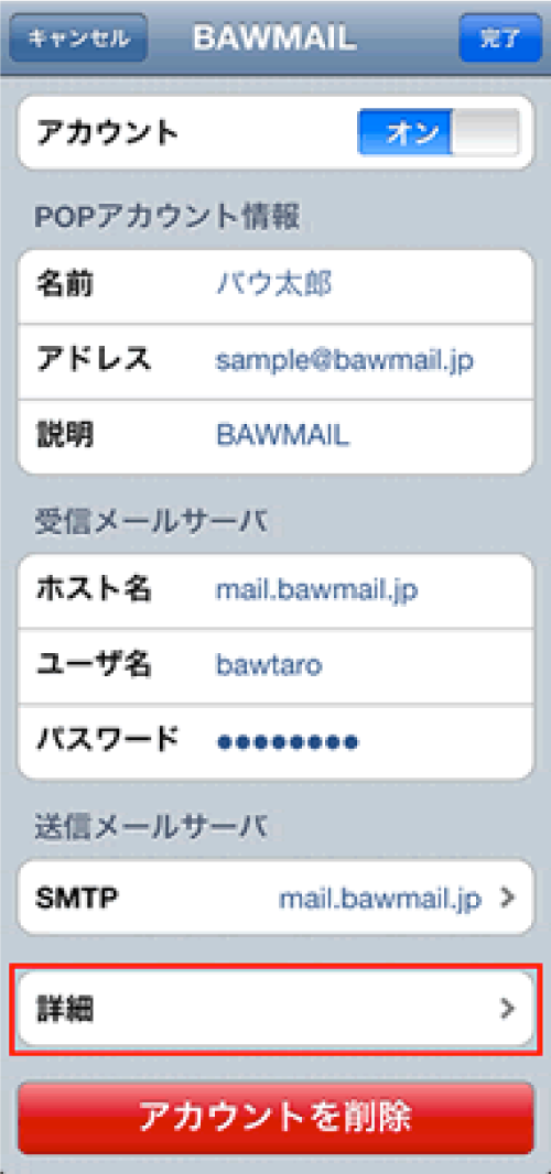 10.[アカウント情報]画面に戻るので、画面を下へスライドし、[詳細]をタップする。