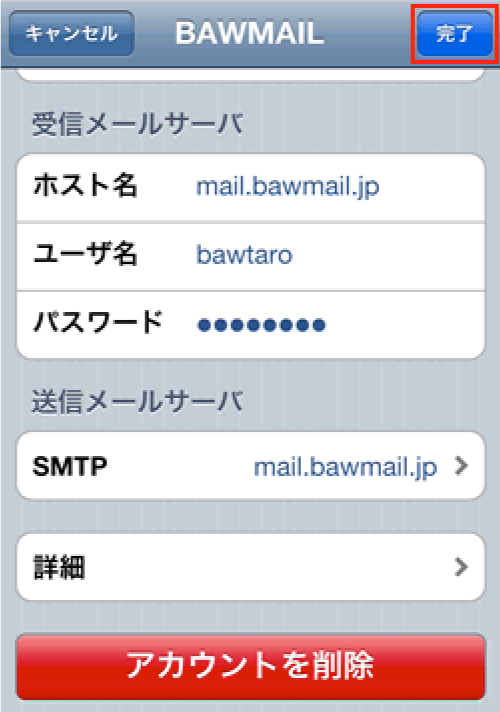 8.受信メールサーバ、送信メールサーバの必要事項を入力し、「保存」をタップします。