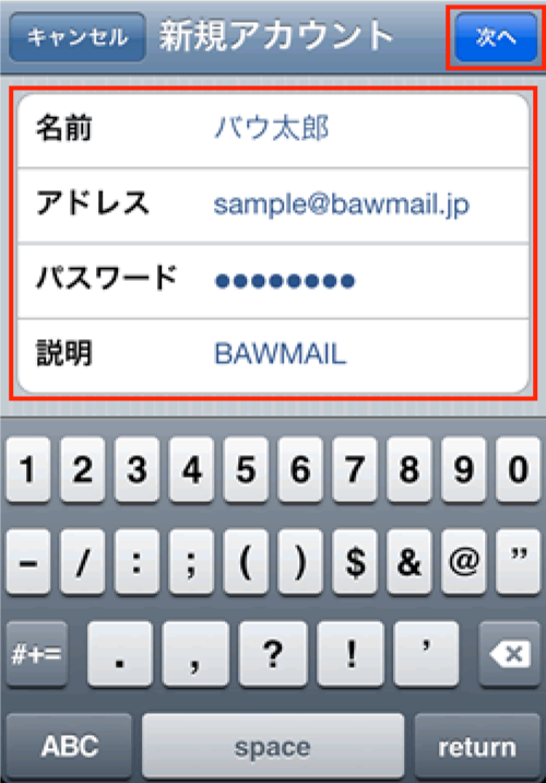 6.新規アカウント情報を入力し、「次へ」をタップします。