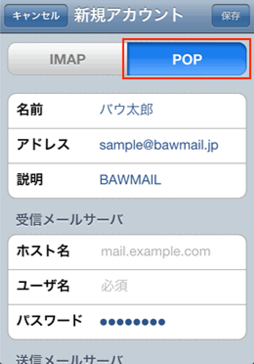 7.サーバー情報を入力する画面が表示されるので[POP]をタップします。