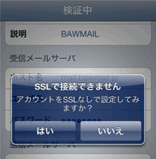 9.設定作業が開始され、「SSLで接続できません」という画面が表示されましたら、「はい」をタップします。