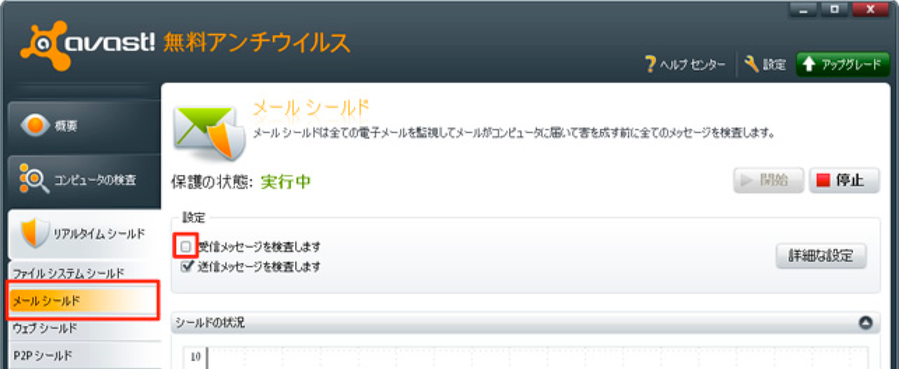 2.開いた設定画面左側のタブから「メールシールド」をクリックし画面を切り替えます。「受信メッセージを検査します」のチェックを外します。